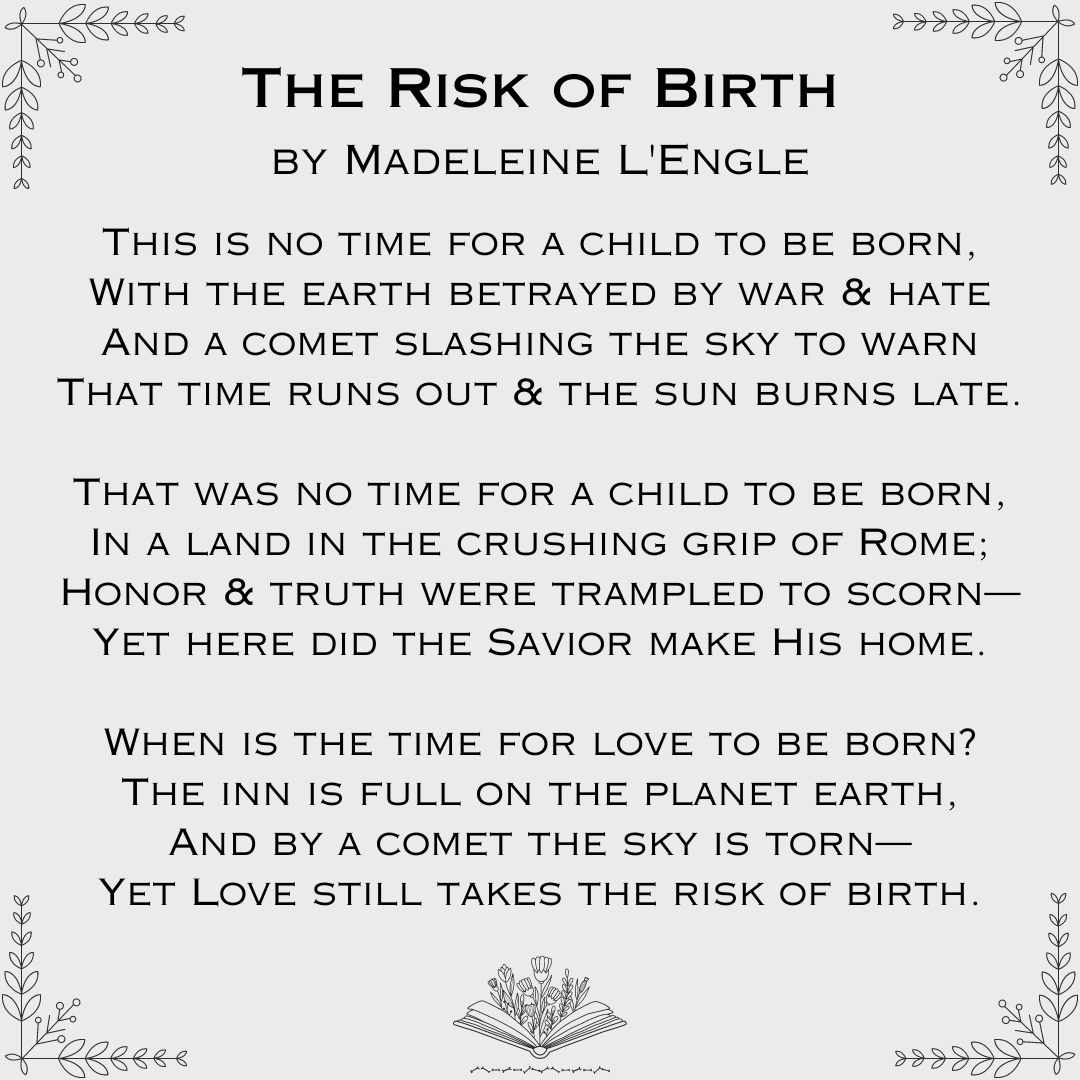 Genevieve’s selection - “The Risk of Birth” by Madeleine L'Engle: https://static.wixstatic.com/media/33805f_10d15067c35e40fdb0cf577b5553272d~mv2.png